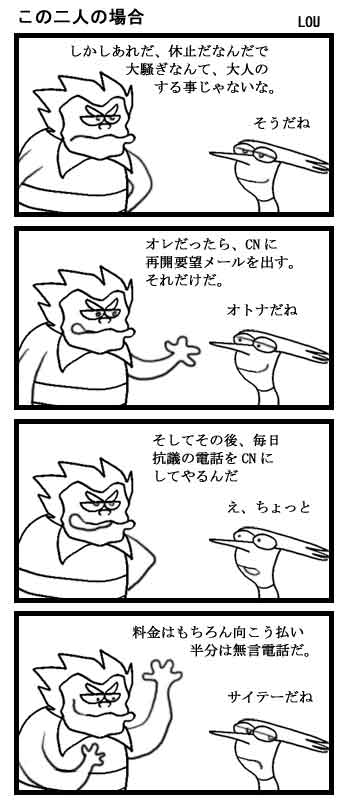 鳥山明の最初のアシスタント。絵がむちゃくちゃ上手い。 何よ、「クローン大戦」のDVDが出るんですって? …すいません、ここまで書いていて悲しくなりました。 それはともかく、DVDは買わせていただきます。 そういえばそれの絡みじゃないけれど、 こんな所にユートニウム博士がっ! L「これってやっぱユートニウム博士ですよね?」 その時は特に意識しなかったんだけど、 KNDの最大の敵であるファーザーはどういうわけか全身シルエット。 KND最大の敵=怪しい大人=ファーザー たまたま「タイムボカン」見てたら、今日が最終回だったのね。 いま日夜テレビを騒がせている「あの人」。 というわけで、今日から堀江のことを「リアルマグワイヤーコーチ」と呼ぶ事にします。 |