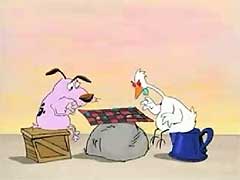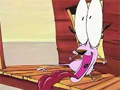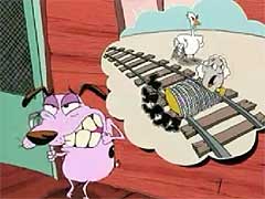宇宙ニワトリの陰謀で、ニワトリ小屋に閉じ込められるカーレッジ。