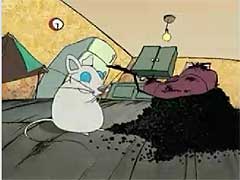 「おくびょうなカーレッジくん」を全部見た!という方でも、どうしても腑に落ちない話があると思います。それは「チキンの逆襲」「宇宙には2羽以上のニワトリ」の二本。何故なら前者は「逆襲」というタイトルが示す通りに、 かつてカーレッジにやられた宇宙ニワトリが、カーレッジに復讐するという話。そして後者は、その宇宙ニワトリの息子達がカーレッジに復讐する、という話。 ところが肝心の、「宇宙ニワトリが最初にカーレッジにやられるお話」がどういうわけか放送されません。これは一体どういう事でしょう? 実はその話こそ、「おくびょうなカーレッジくん」のパイロットフィルムなのです。海外原題を「Chicken From Outer Space」。日本語タイトルを「宇宙ニワトリの侵略」と言います。まさに「第0話」と言ってもいいでしょう。 そもそも「おくびょうなカーレッジくん」は、カートゥーンネットワークの「カートゥーンカートゥーンズ」という枠に入っています。そしてこの枠は、文字通り様々な番組の「勝ち抜き」となっています。新人に作品を作らせ、その中で面白かった物を視聴者投票で決め、好評だった作品をレギュラーとして制作する、というシステムを取っています。もちろん「デクスターズラボ」や「パワーパフガールズ」なども、そこを勝ち抜いてきました。そしてその「宇宙ニワトリの侵略」は、まさにその「勝ち抜き」のために製作されたエピソードだったのです。 これは今見ると、キャラクターの雰囲気などがかなり違います。また10分程度の短さのため、通常放送には組み込まれていません。ちなみに日本ではこの作品は日本語吹き替え版も製作され、、一時期「ホワット ア カートゥーン」枠などで見れたようなのですが、現在ではスペシャル企画などの特殊な枠以外では放送されていないようです。 ただこの中に、現在の「おくびょうなカーレッジくん」のまさに基礎と言える物がびっしりと詰まっています。そこで今回は特別に画像の一部を、(こっそりと)ご紹介したいと思います。 |
