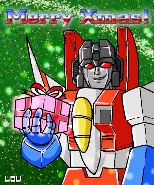 遅くなりましたが、トップ絵をクリスマス仕様にしました。すっかりトランスフォーマーにハマってしまってるので、今回はスタースクリームを描いてみました。しかしこうして改めて見てみると、スタースクリームって、白、赤、青、黄の「オモチャ配色」なんですよね。